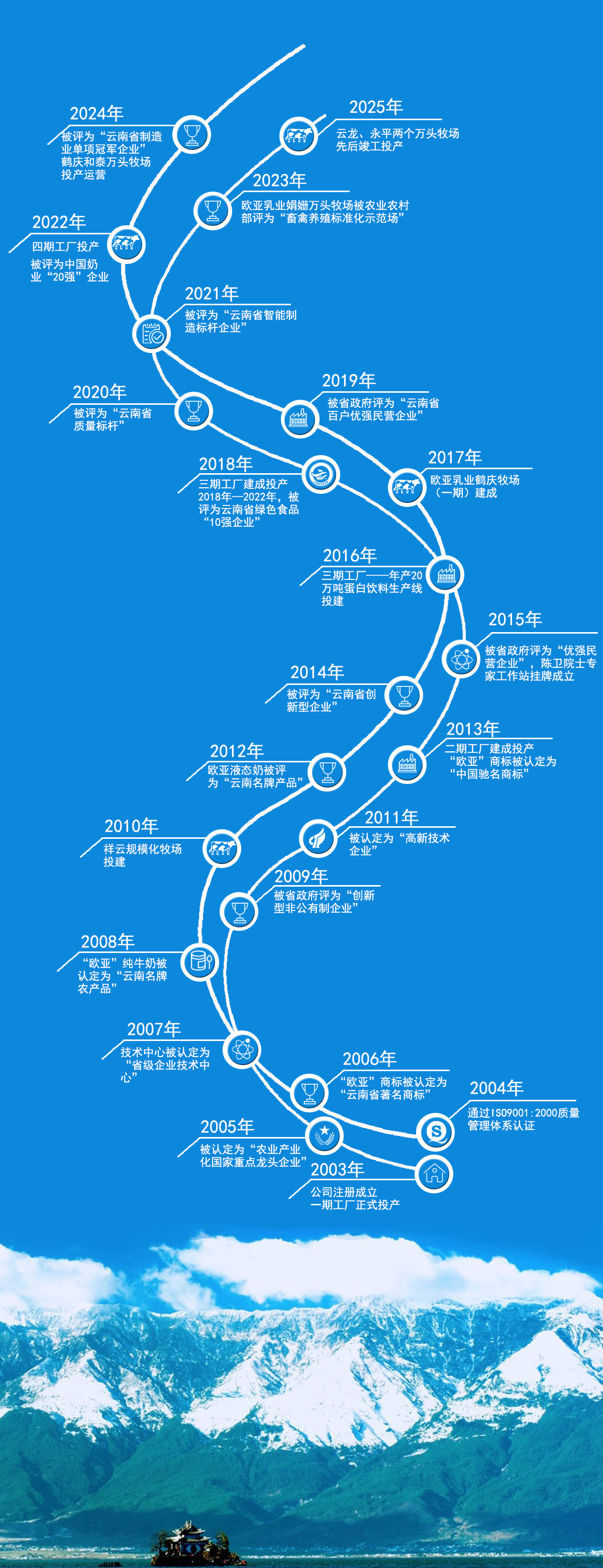 云南欧亚乳业有限公司,于2003年在云南大理注册成立,历经20余年发展,公司已逐步成长为我国南方地区规模较大、经济社会效益较好、品牌综合影响力较强、产品深受消费者喜爱的乳业龙头企业,相继荣获“农业产业化国家重点龙头企业”、中国奶业“20强”企业、“云南省重点产业领军企业”、云南省绿色食品“10强企业”等百余项荣誉,“欧亚”商标被评为“中国驰名商标”,产品通过绿色食品、有机产品认证。